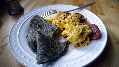 Monday deserves a good breakfast. This was scrambled eggs, nopales and blood sausage (moronga).