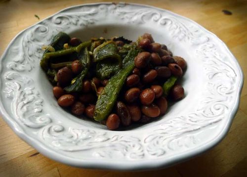 One of my favorite way to eat beans is with roasted poblano chiles. I think green bell peppers are ok but you really can't compare them to a big, meaty...