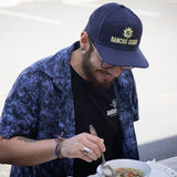 Our navy and gold "snap back" cap is made from cotton twill with custom embroidery.