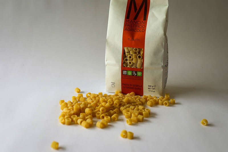 Mancini uses circular bronze die plates and dries the Tubetti at temperatures between min. 36°C and max 55°C, taking 22 hours. The result is premium pasta ready for a little butter and cheese or your most elaborate sauces. We tend to like them for pasta e fagioli!